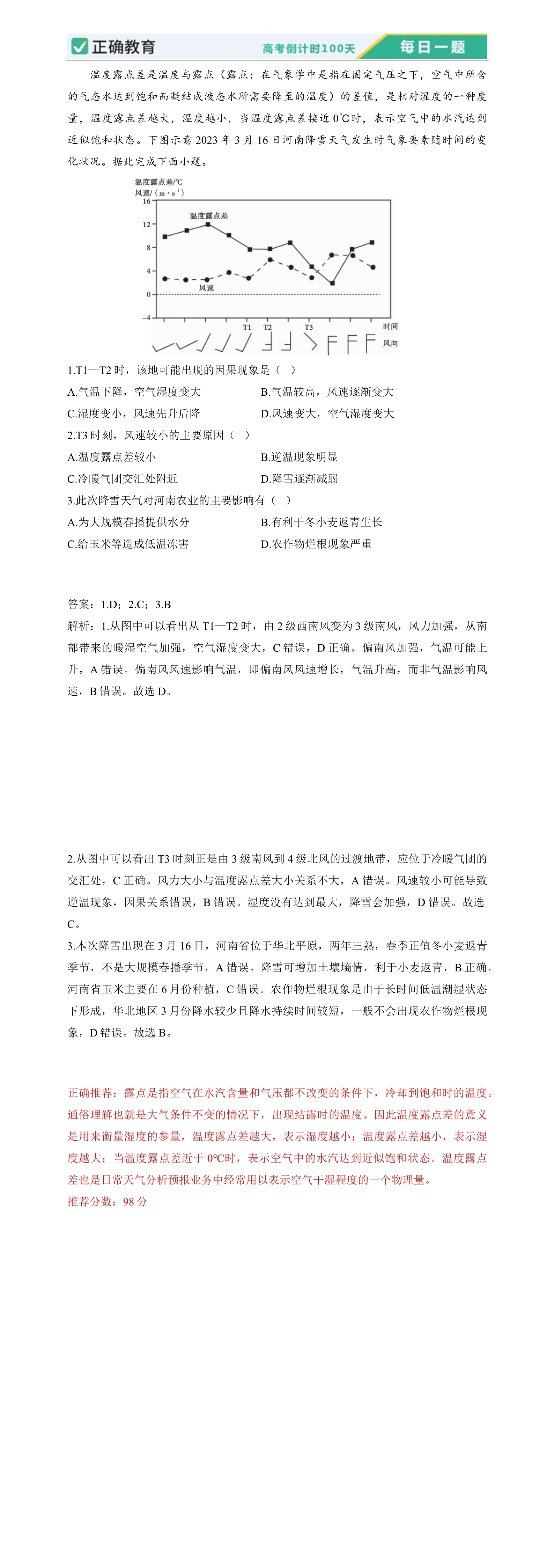 正确推荐:露点是指空气在水汽含量和气压都不改变的条件下,冷却到饱和时的温度。通俗理解也就是大气条件不变的情况下,出现结露时的温度。因此温度露点差的意义是用来衡量湿度的参量,温度露点差越大,表示湿度越小;温度露点差越小,表示湿度越大;当温度露点差近于0℃时,表示空气中的水汽达到近似饱和状态。温度露点差也是日常天气分析预报业务中经常用以表示空气干湿程度的一个物理量。 推荐分数:98分