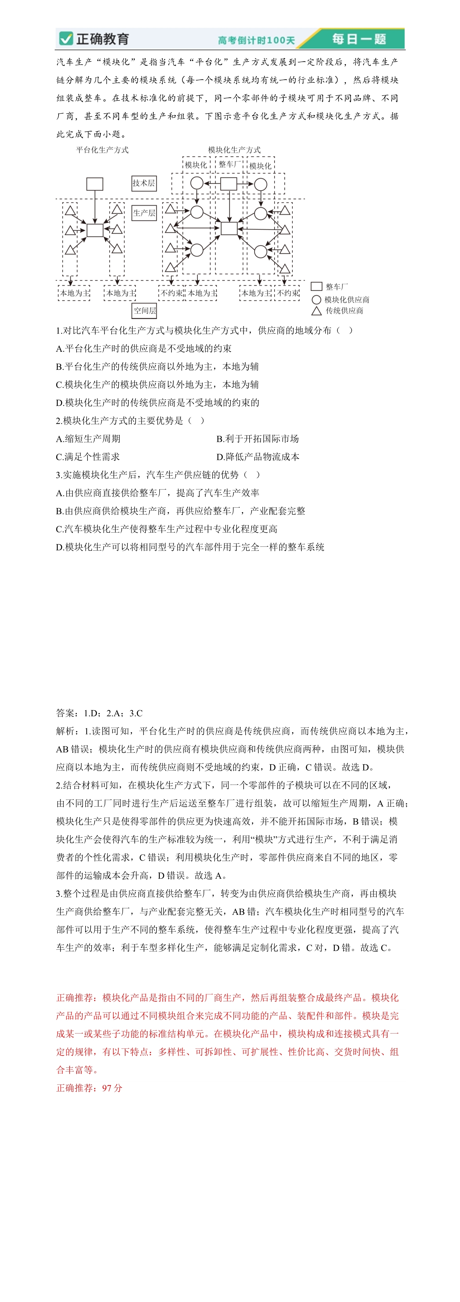 正确推荐:模块化产品是指由不同的厂商生产,然后再组装整合成最终产品。模块化产品的产品可以通过不同模块组合来完成不同功能的产品、装配件和部件。模块是完成某一或某些子功能的标准结构单元。在模块化产品中,模块构成和连接模式具有一定的规律,有以下特点:多样性、可拆卸性、可扩展性、性价比高、交货时间快、组合丰富等。 正确推荐:97分