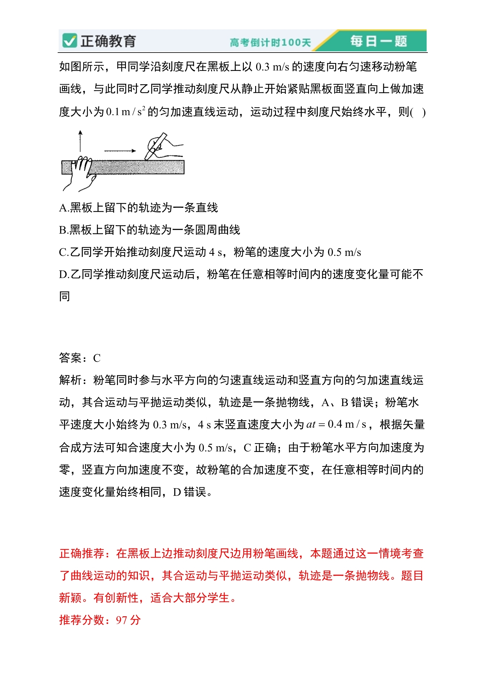正确推荐:在黑板上边推动刻度尺边用粉笔画线,本题通过这一情境考查了曲线运动的知识,其合运动与平抛运动类似,轨迹是一条抛物线。题目新颖。有创新性,适合大部分学生。 推荐分数:97分