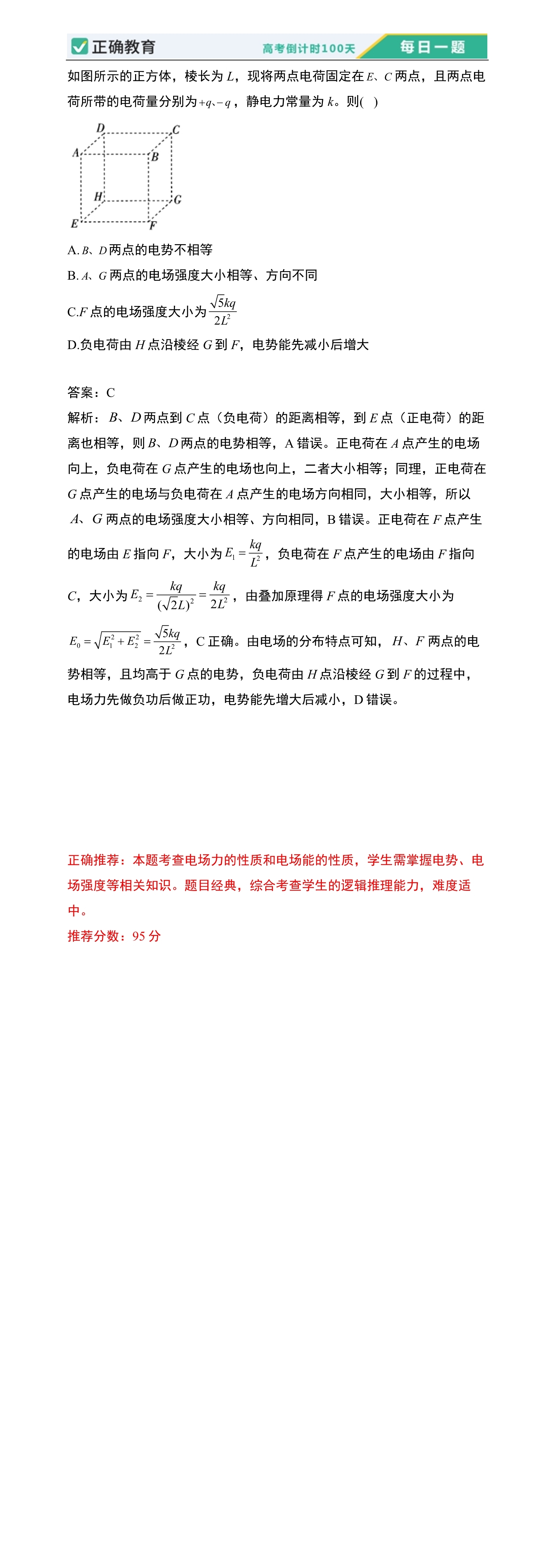 正确推荐:本题考查电场力的性质和电场能的性质,学生需掌握电势、电场强度等相关知识。题目经典,综合考查学生的逻辑推理能力,难度适中。 推荐分数:95分