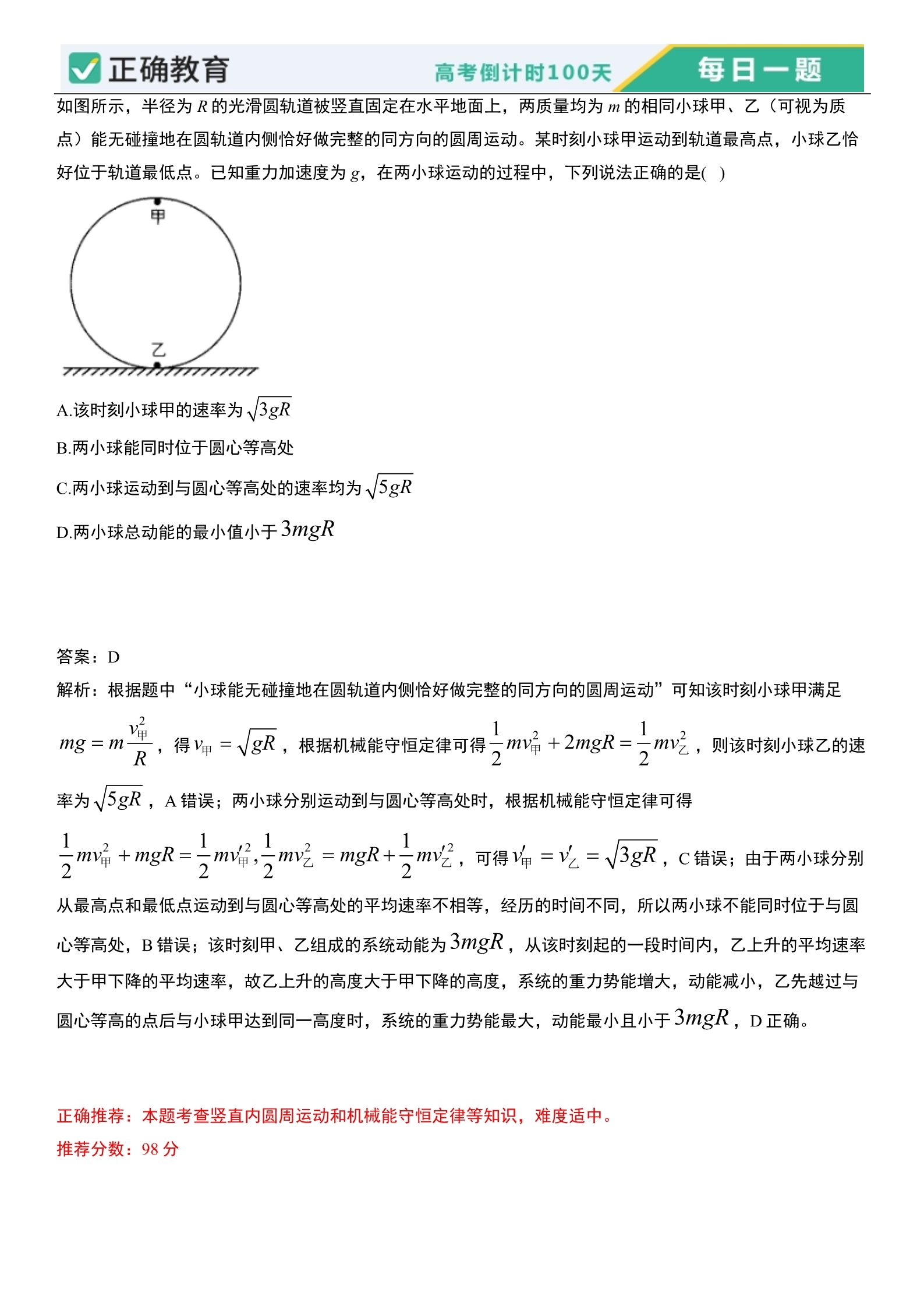 正确推荐:本题考查竖直内圆周运动和机械能守恒定律等知识,难度适中。 推荐分数:98分