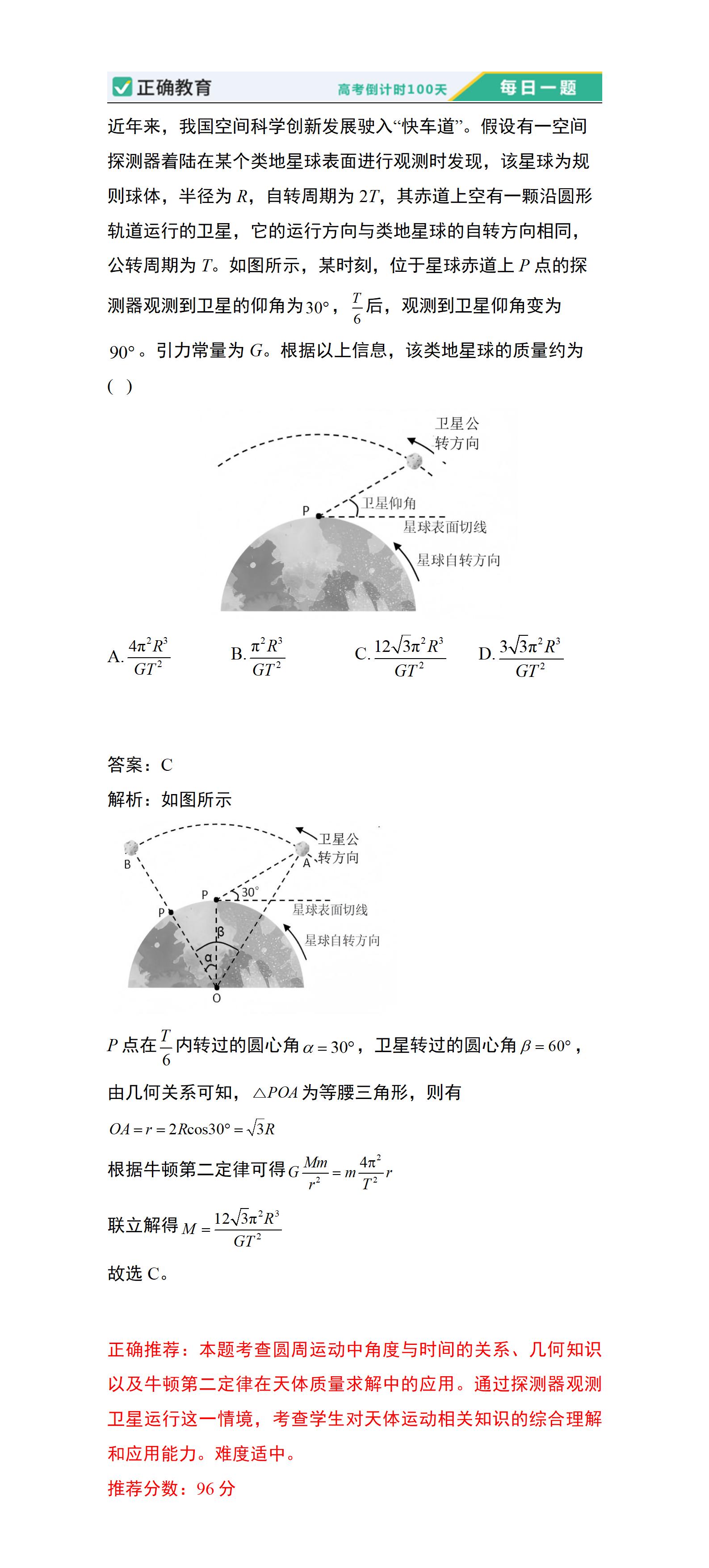 正确推荐:本题考查圆周运动中角度与时间的关系、几何知识以及牛顿第二定律在天体质量求解中的应用。通过探测器观测卫星运行这一情境,考查学生对天体运动相关知识的综合理解和应用能力。难度适中。 推荐分数:96分