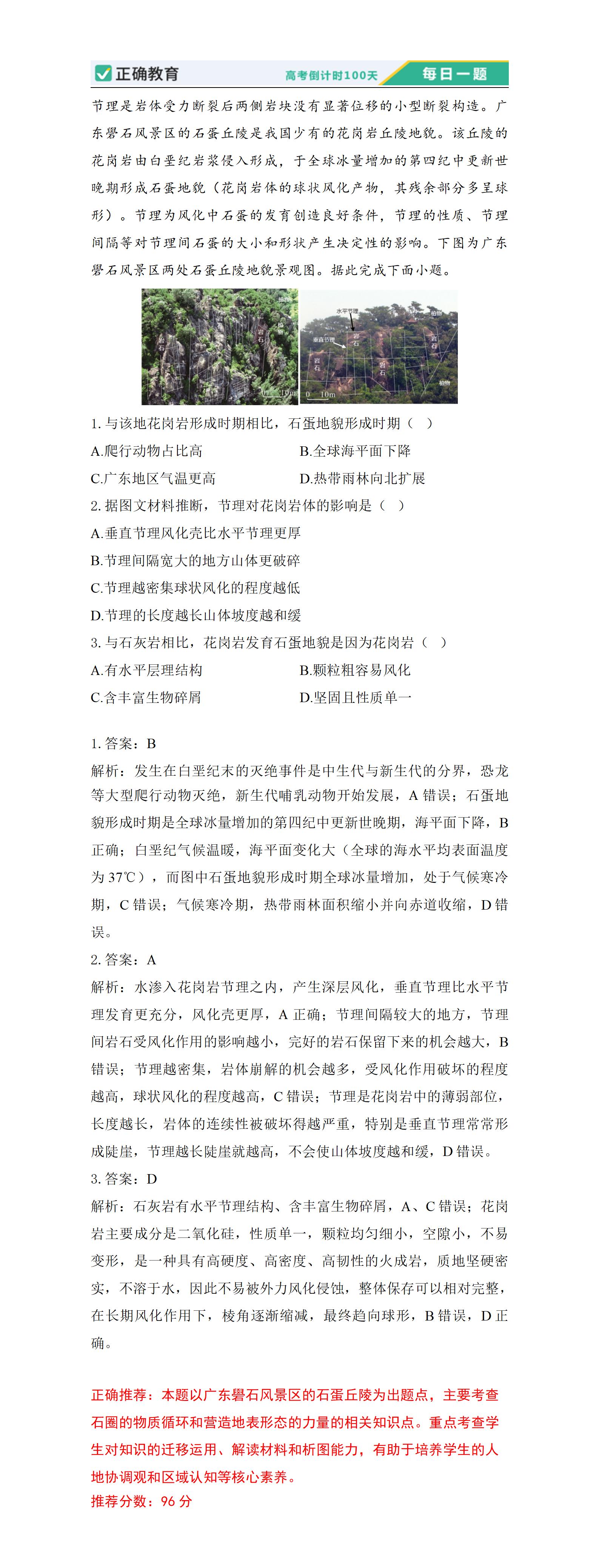 正确推荐:本题以广东礐石风景区的石蛋丘陵为出题点,主要考查石圈的物质循环和营造地表形态的力量的相关知识点。重点考查学生对知识的迁移运用、解读材料和析图能力,有助于培养学生的人地协调观和区域认知等核心素养。 推荐分数:96分