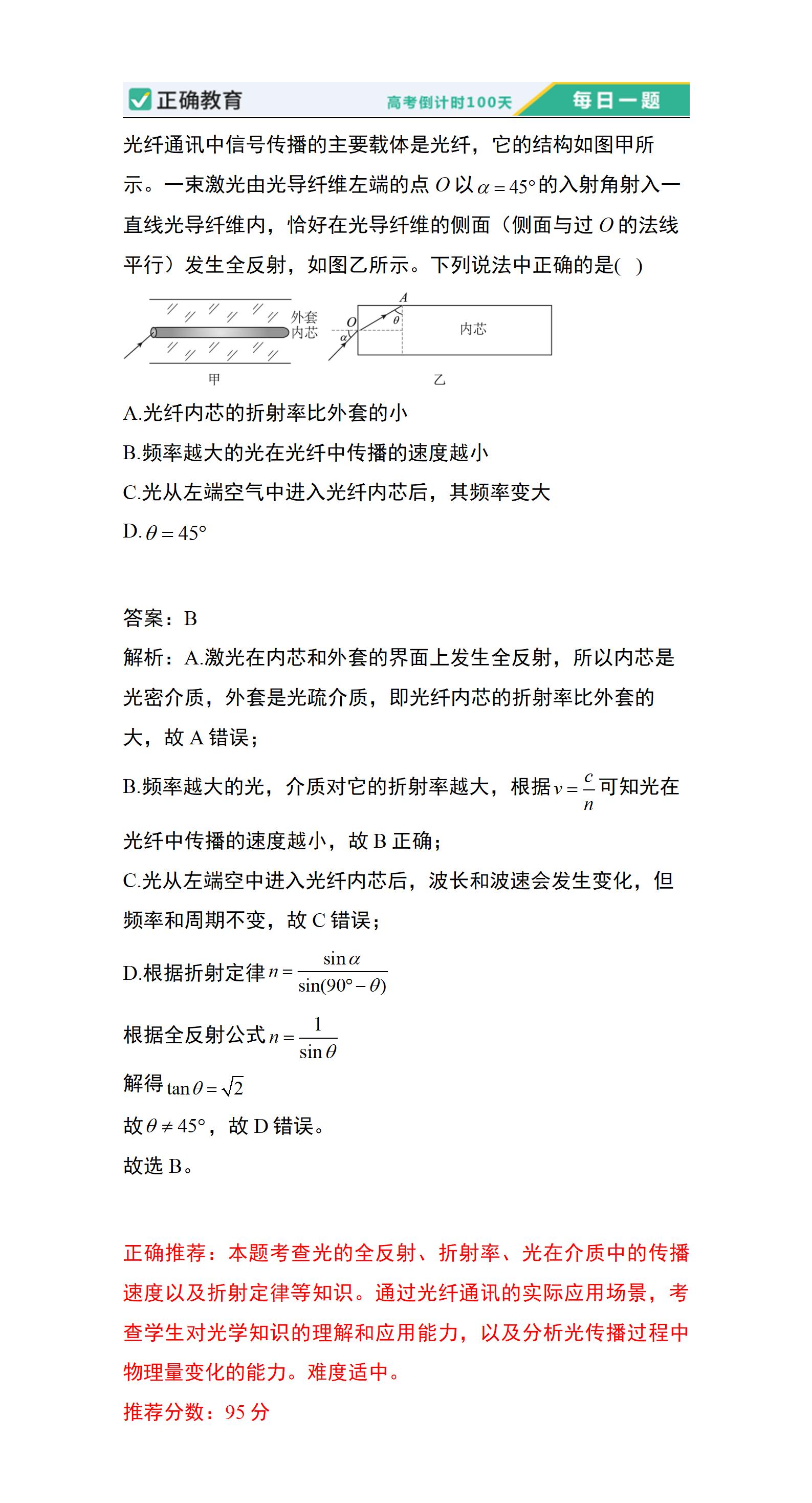 正确推荐:本题考查光的全反射、折射率、光在介质中的传播速度以及折射定律等知识。通过光纤通讯的实际应用场景,考查学生对光学知识的理解和应用能力,以及分析光传播过程中物理量变化的能力。难度适中。 推荐分数:95分