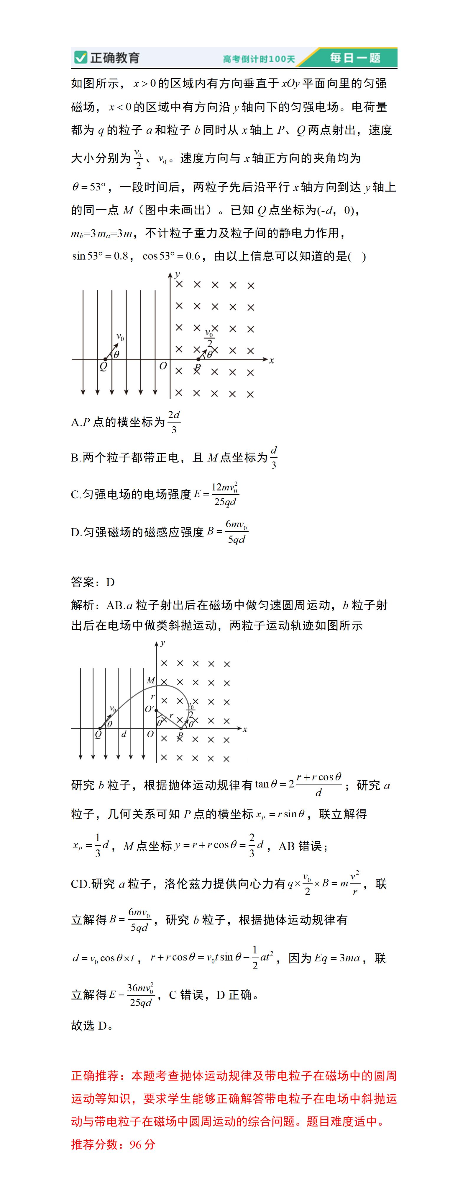 正确推荐:本题考查抛体运动规律及带电粒子在磁场中的圆周运动等知识,要求学生能够正确解答带电粒子在电场中斜抛运动与带电粒子在磁场中圆周运动的综合问题。题目难度适中。 推荐分数:96分