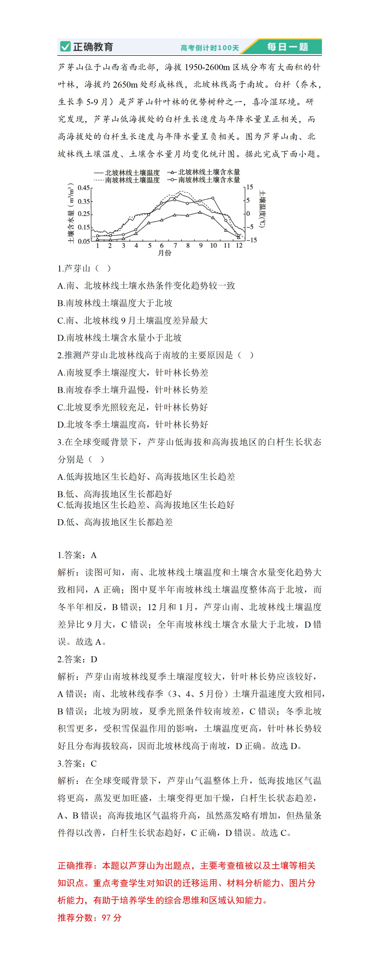 正确推荐:本题以芦芽山为出题点,主要考查植被以及土壤等相关知识点。重点考查学生对知识的迁移运用、材料分析能力、图片分析能力,有助于培养学生的综合思维和区域认知能力。 推荐分数:97分