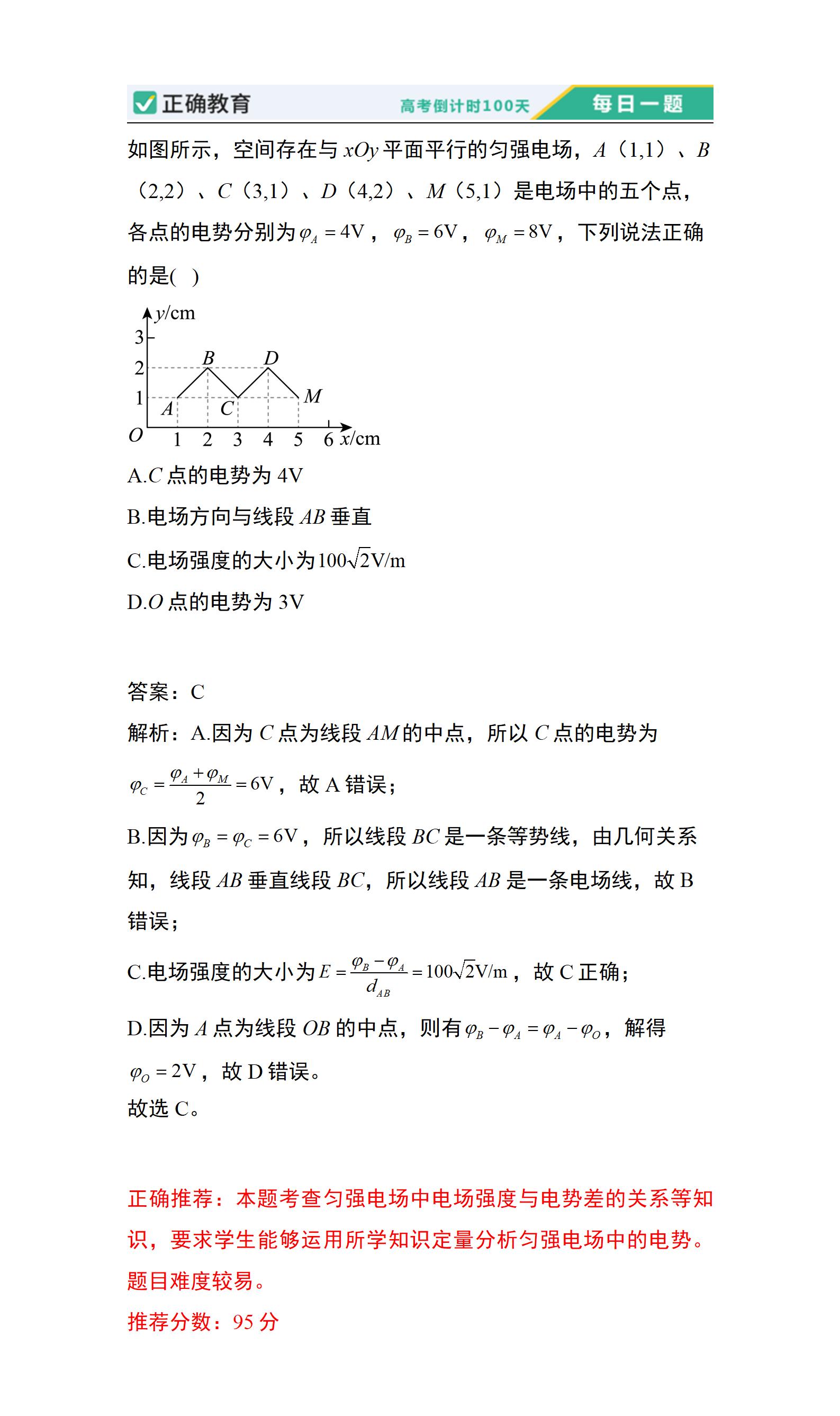 正确推荐:本题考查匀强电场中电场强度与电势差的关系等知识,要求学生能够运用所学知识定量分析匀强电场中的电势。题目难度较易。 推荐分数:95分