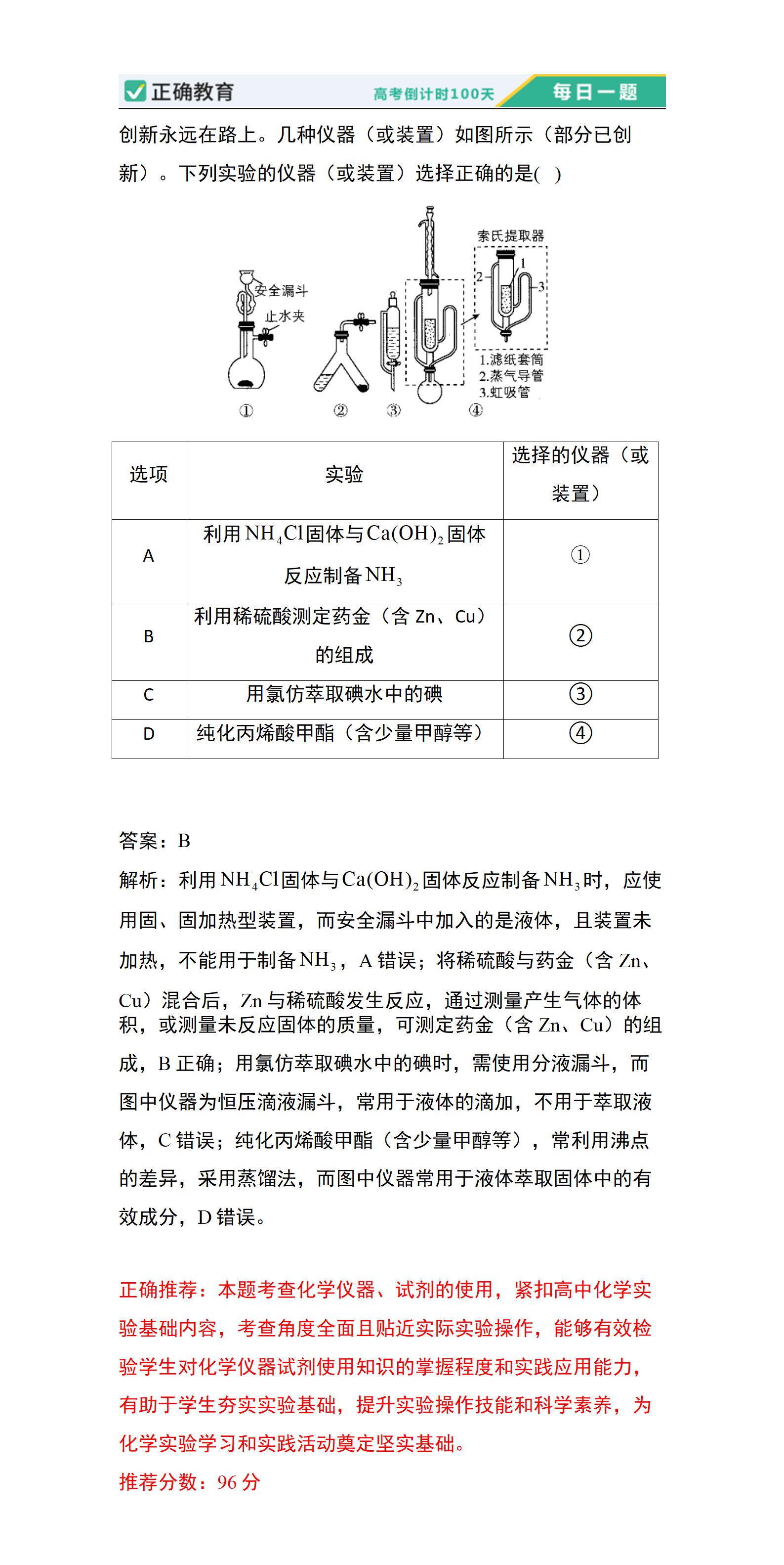 正确推荐:本题考查化学仪器、试剂的使用,紧扣高中化学实验基础内容,考查角度全面且贴近实际实验操作,能够有效检验学生对化学仪器试剂使用知识的掌握程度和实践应用能力,有助于学生夯实实验基础,提升实验操作技能和科学素养,为化学实验学习和实践活动奠定坚实基础。 推荐分数:96分