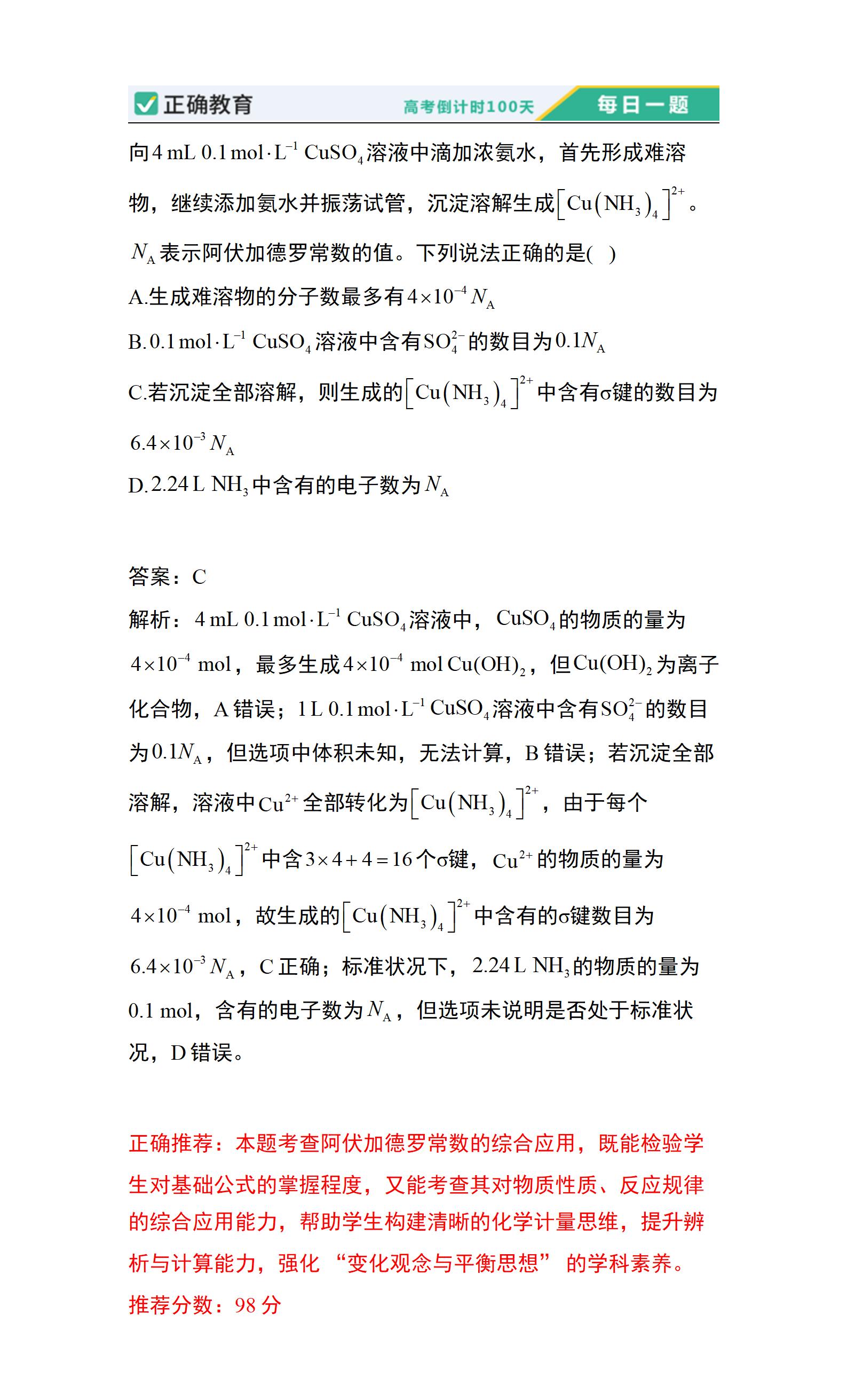 正确推荐:本题考查阿伏加德罗常数的综合应用,既能检验学生对基础公式的掌握程度,又能考查其对物质性质、反应规律的综合应用能力,帮助学生构建清晰的化学计量思维,提升辨析与计算能力,强化 “变化观念与平衡思想” 的学科素养。 推荐分数:98分