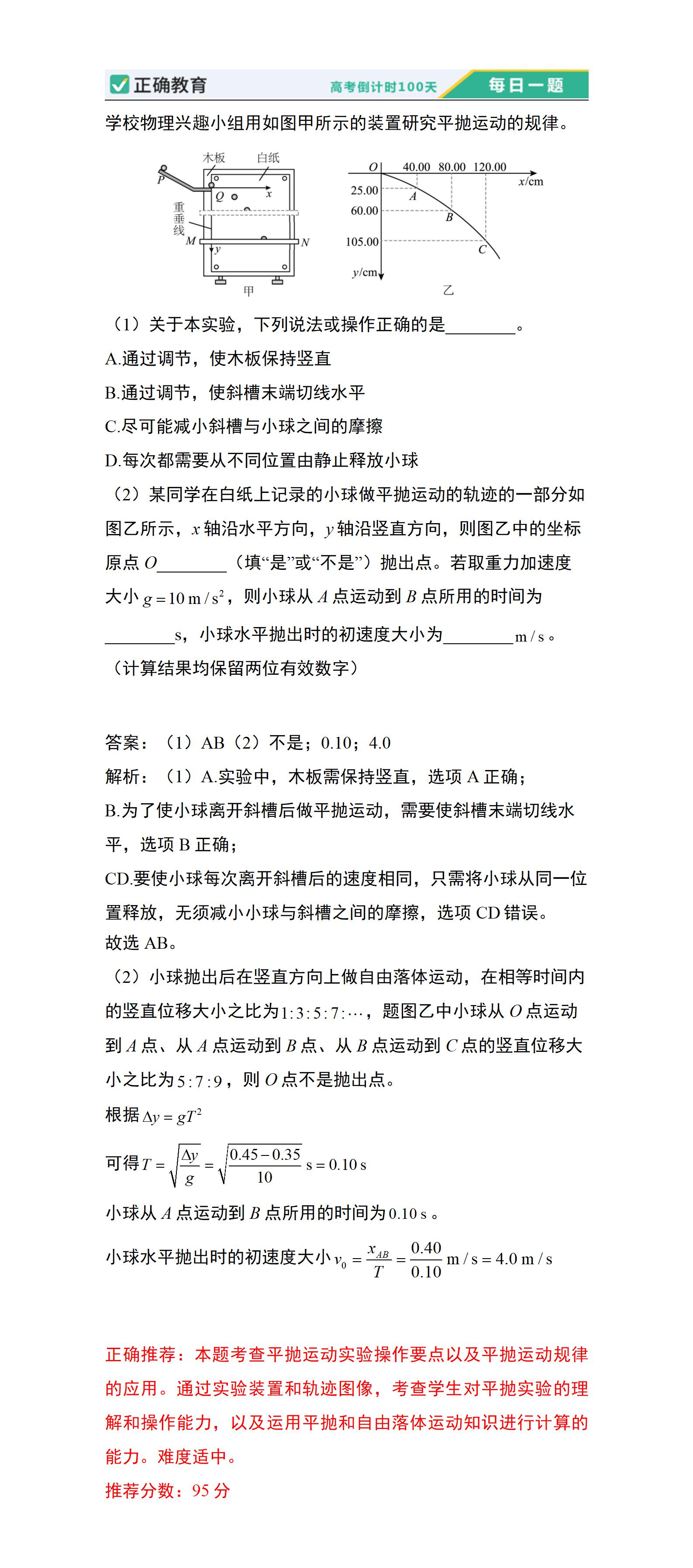 正确推荐:本题考查平抛运动实验操作要点以及平抛运动规律的应用。通过实验装置和轨迹图像,考查学生对平抛实验的理解和操作能力,以及运用平抛和自由落体运动知识进行计算的能力。难度适中。 推荐分数:95分