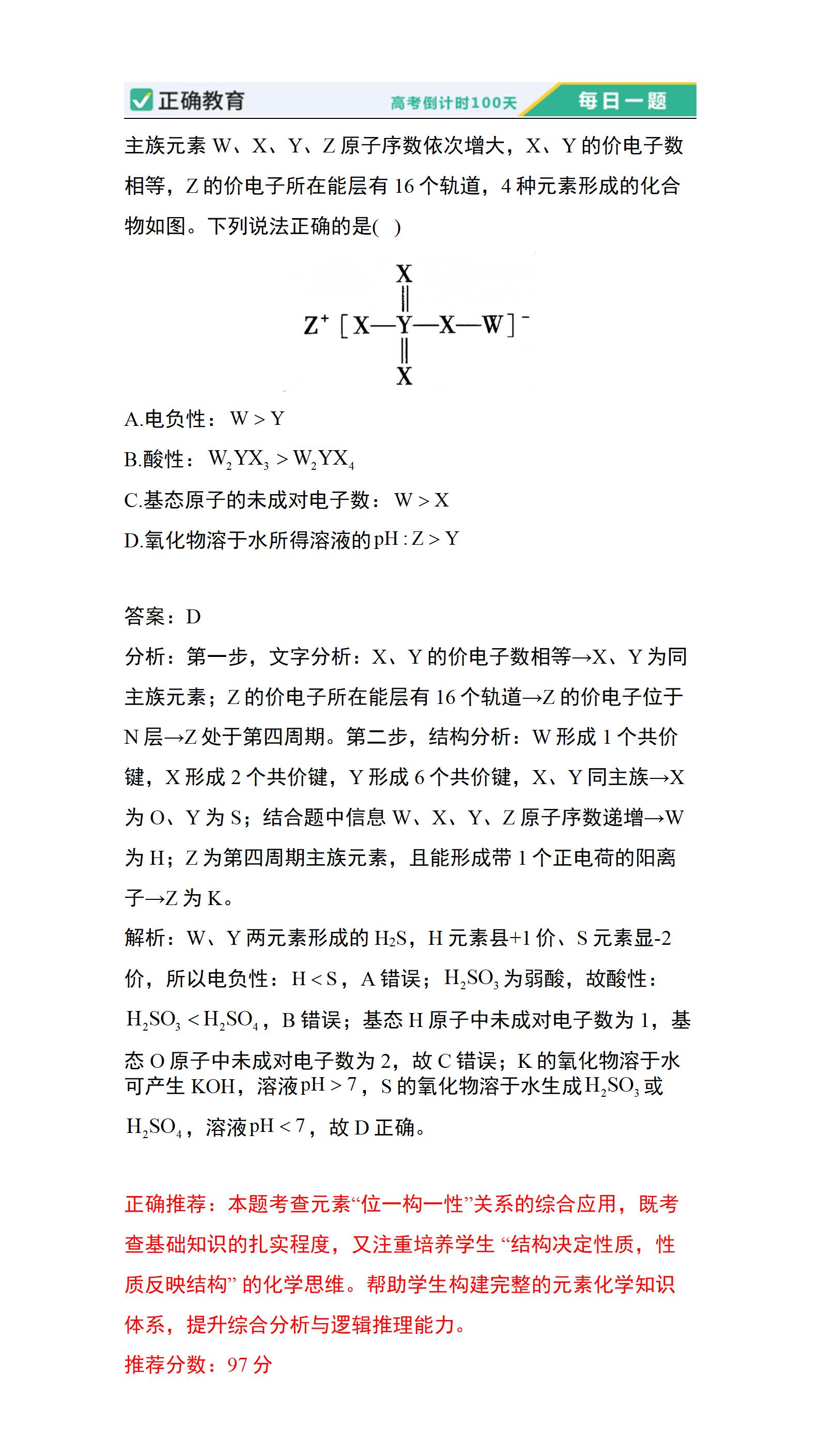 正确推荐:本题考查元素“位一构一性”关系的综合应用,既考查基础知识的扎实程度,又注重培养学生 “结构决定性质,性质反映结构” 的化学思维。帮助学生构建完整的元素化学知识体系,提升综合分析与逻辑推理能力。 推荐分数:97分
