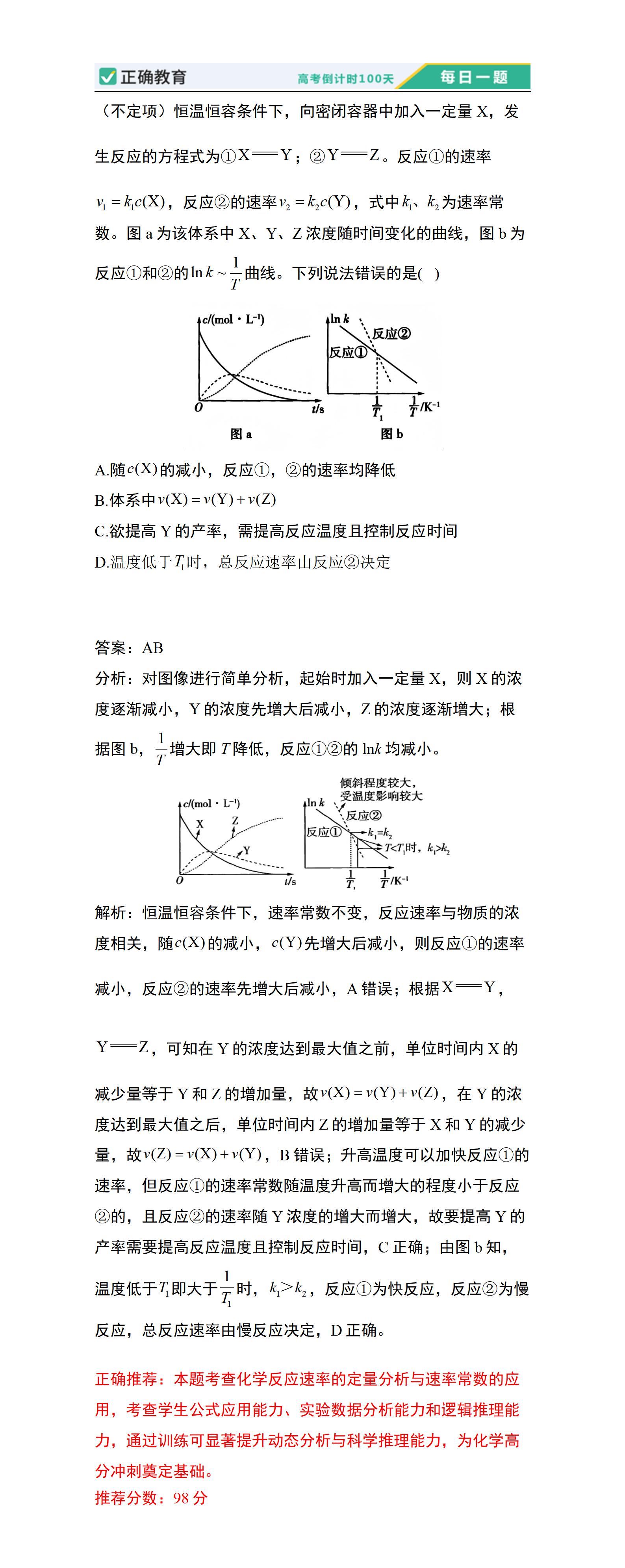 正确推荐:本题考查化学反应速率的定量分析与速率常数的应用,考查学生公式应用能力、实验数据分析能力和逻辑推理能力,通过训练可显著提升动态分析与科学推理能力,为化学高分冲刺奠定基础。 推荐分数:98分