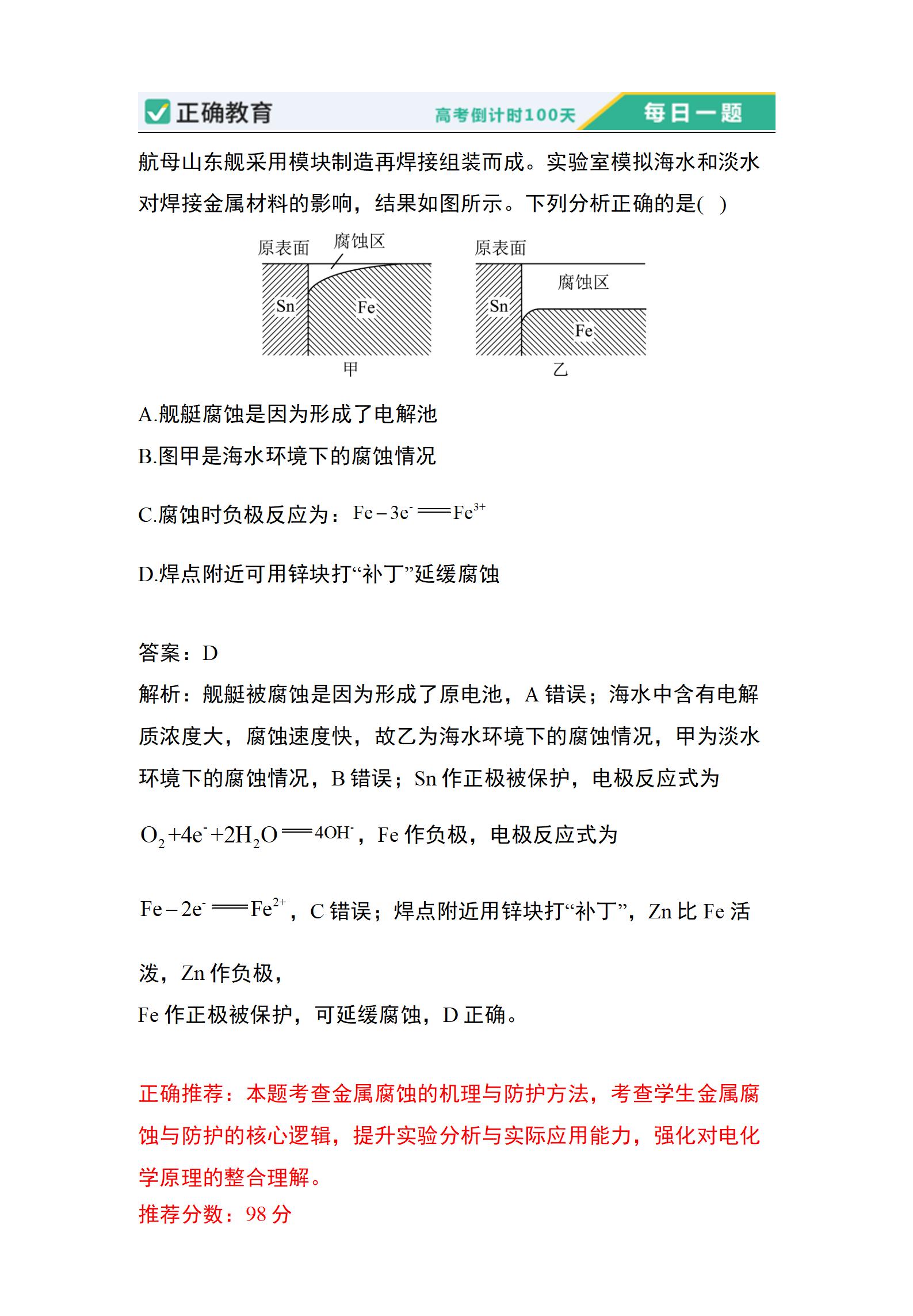 正确推荐:本题考查金属腐蚀的机理与防护方法,考查学生金属腐蚀与防护的核心逻辑,提升实验分析与实际应用能力,强化对电化学原理的整合理解。 推荐分数:98分