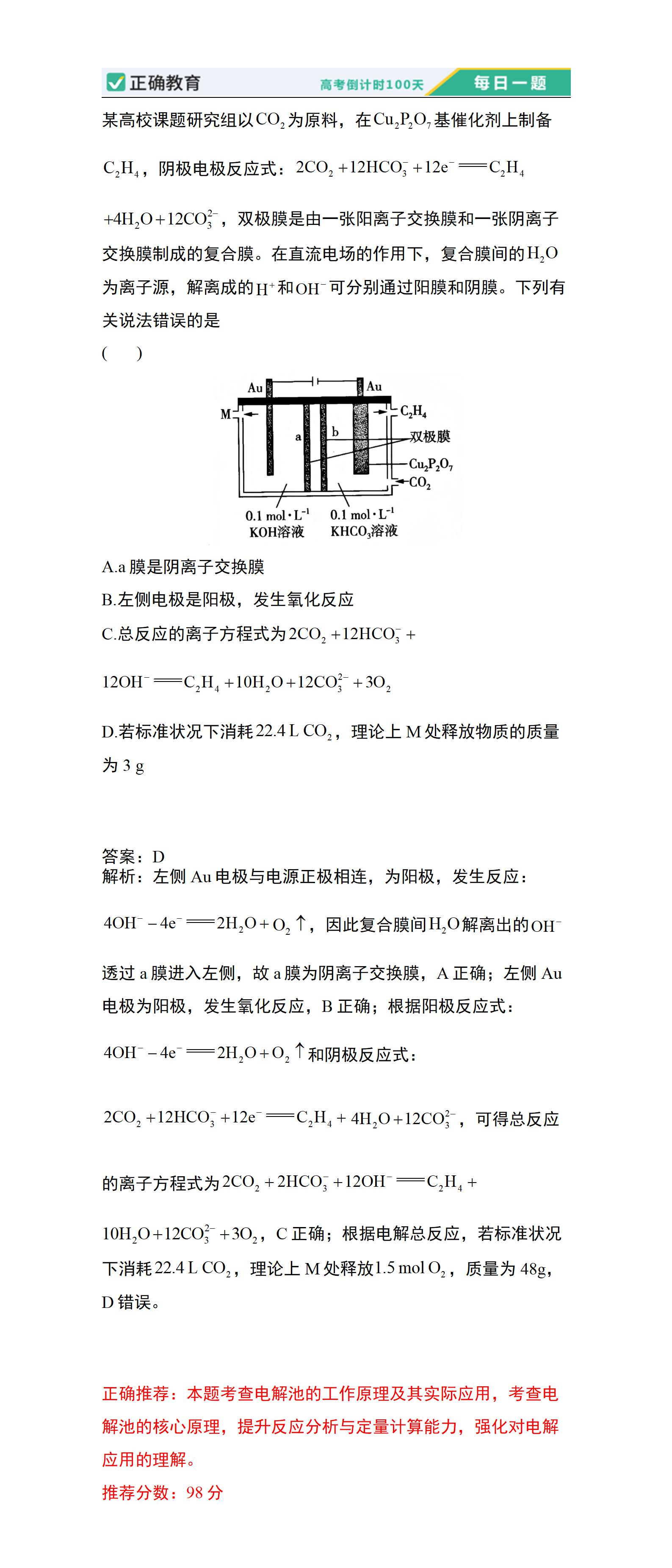 正确推荐:本题考查电解池的工作原理及其实际应用,考查电解池的核心原理,提升反应分析与定量计算能力,强化对电解应用的理解。 推荐分数:98分
