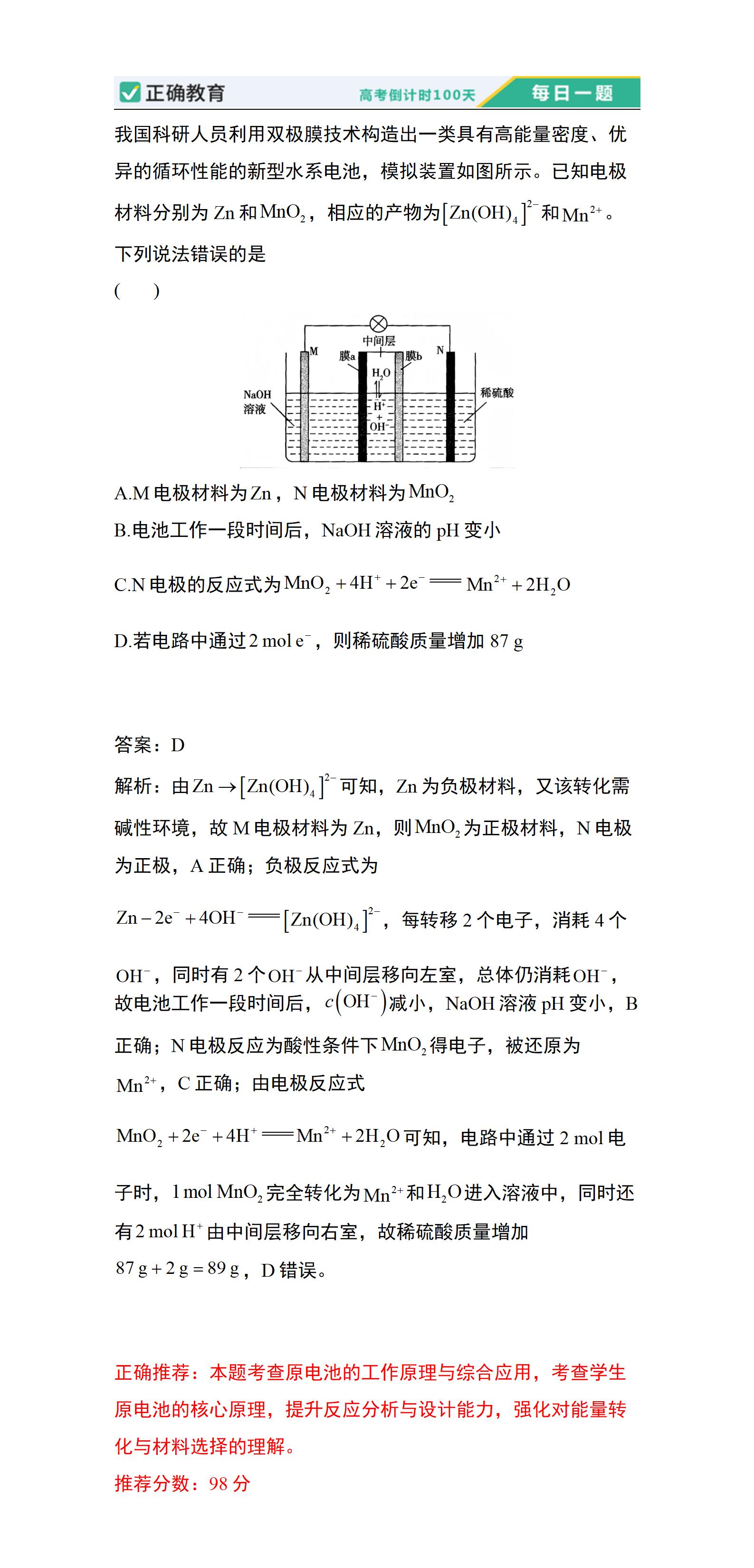 正确推荐:本题考查原电池的工作原理与综合应用,考查学生原电池的核心原理,提升反应分析与设计能力,强化对能量转化与材料选择的理解。 推荐分数:98分
