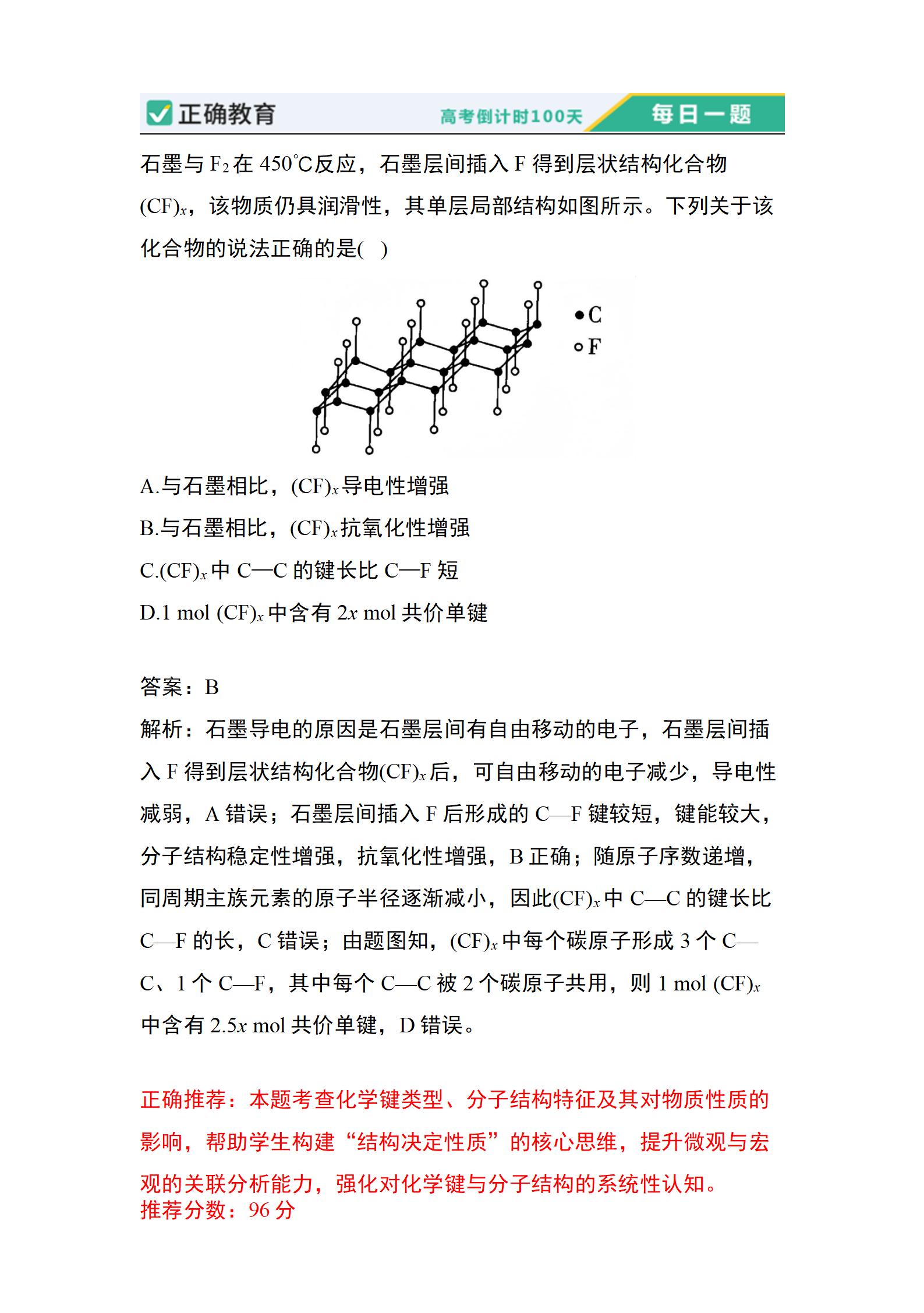 正确推荐:本题考查化学键类型、分子结构特征及其对物质性质的影响,帮助学生构建“结构决定性质”的核心思维,提升微观与宏观的关联分析能力,强化对化学键与分子结构的系统性认知。 推荐分数:96分