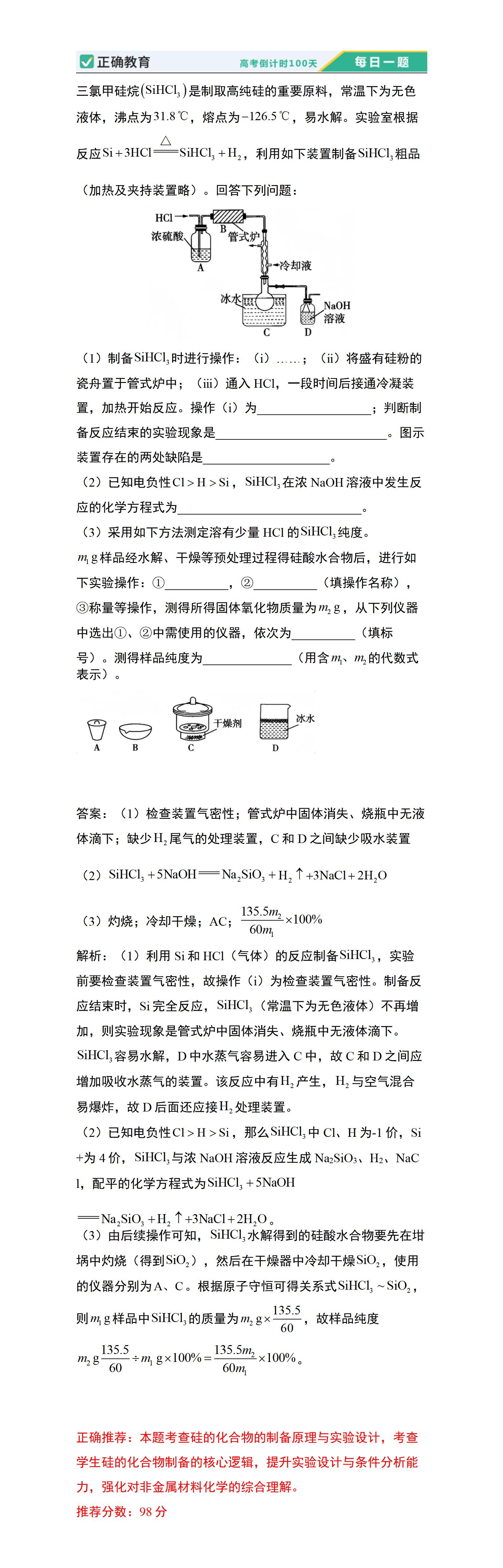正确推荐:本题考查硅的化合物的制备原理与实验设计,考查学生硅的化合物制备的核心逻辑,提升实验设计与条件分析能力,强化对非金属材料化学的综合理解。 推荐分数:98分