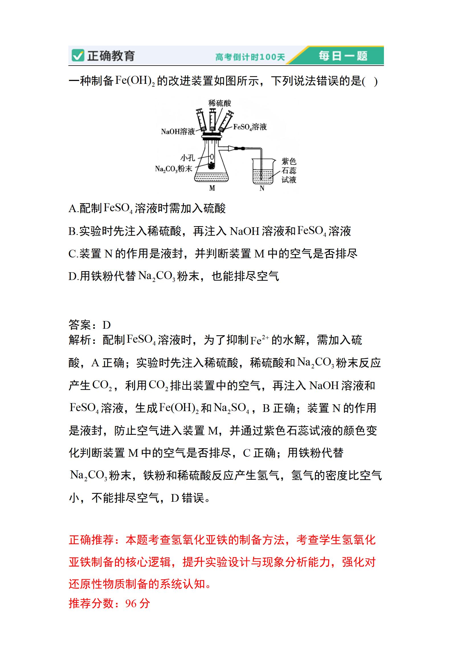 正确推荐:本题考查氢氧化亚铁的制备方法,考查学生氢氧化亚铁制备的核心逻辑,提升实验设计与现象分析能力,强化对还原性物质制备的系统认知。 推荐分数:96分
