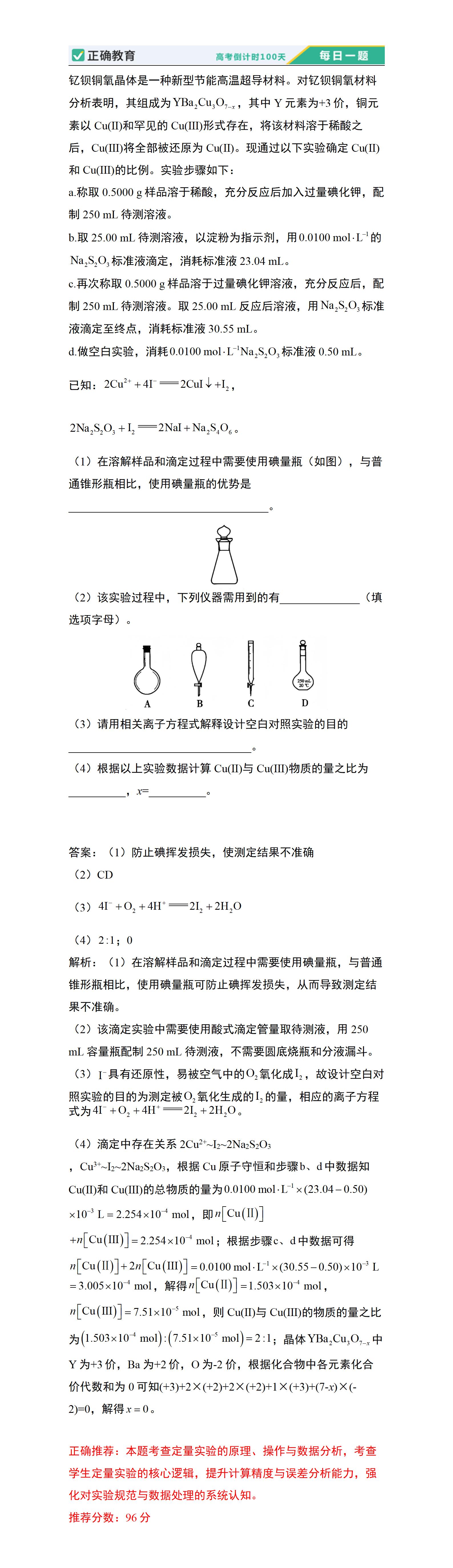 正确推荐:本题考查定量实验的原理、操作与数据分析,考查学生定量实验的核心逻辑,提升计算精度与误差分析能力,强化对实验规范与数据处理的系统认知。 推荐分数:96分