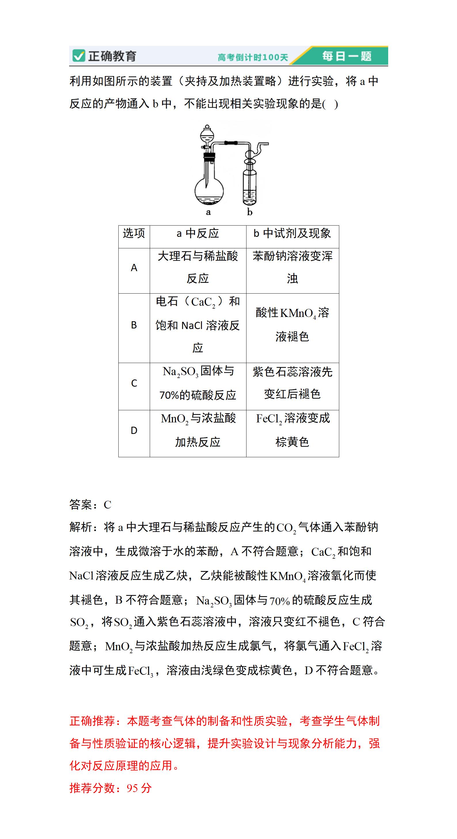 正确推荐:本题考查气体的制备和性质实验,考查学生气体制备与性质验证的核心逻辑,提升实验设计与现象分析能力,强化对反应原理的应用。 推荐分数:95分