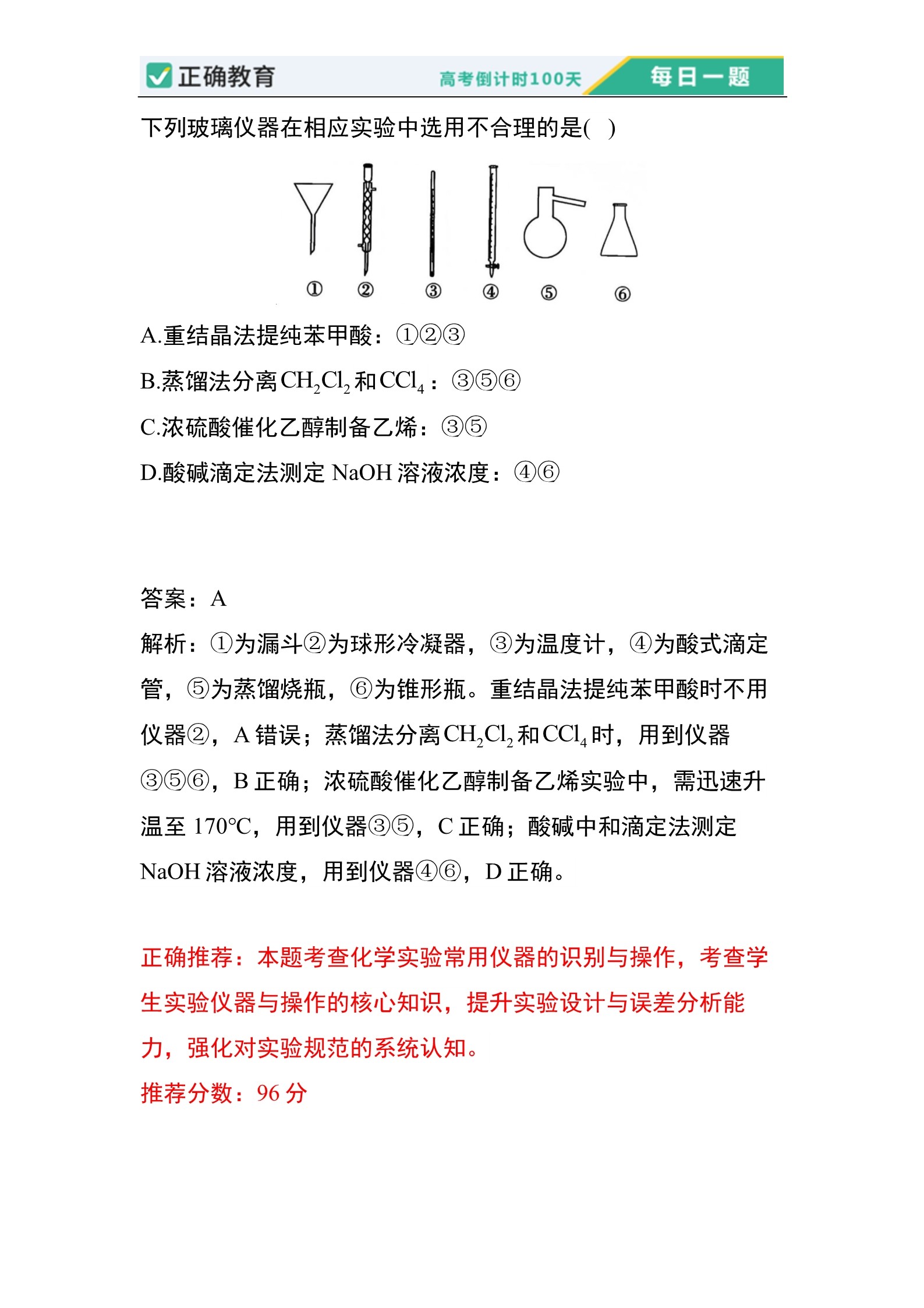 正确推荐:本题考查化学实验常用仪器的识别与操作,考查学生实验仪器与操作的核心知识,提升实验设计与误差分析能力,强化对实验规范的系统认知。 推荐分数:96分
