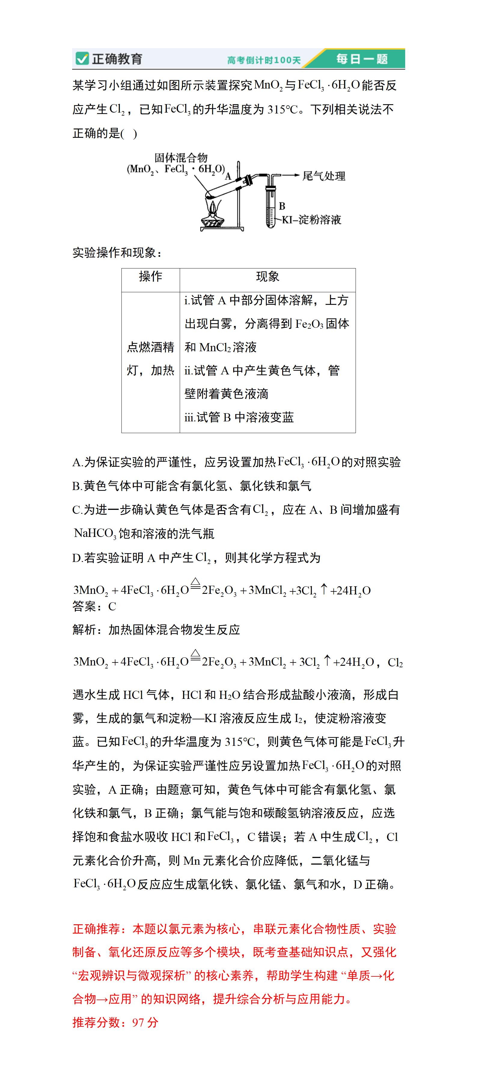 正确推荐:本题以氯元素为核心,串联元素化合物性质、实验制备、氧化还原反应等多个模块,既考查基础知识点,又强化 “宏观辨识与微观探析” 的核心素养,帮助学生构建 “单质→化合物→应用” 的知识网络,提升综合分析与应用能力。 推荐分数:97分
